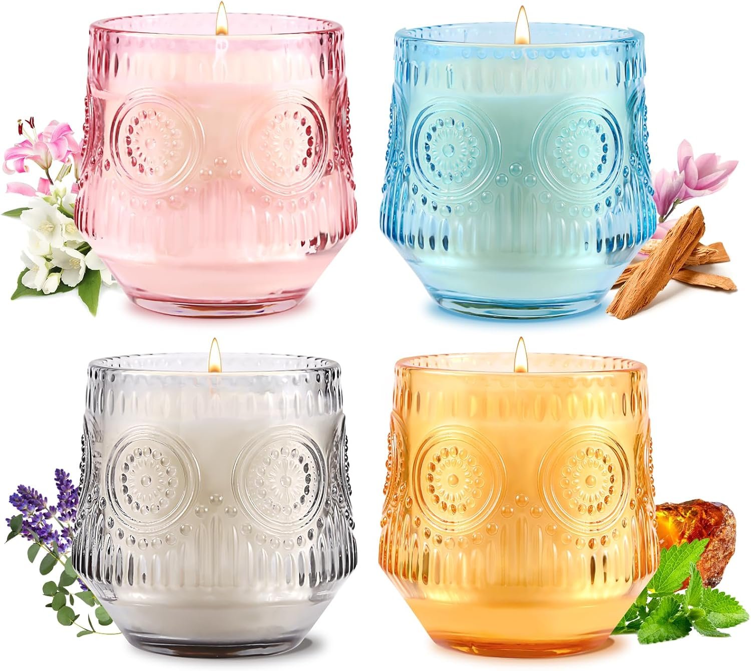 - 4 Pack Scented Candle Set: Introducing our new luxurious glass jar candle set! 4 colors and 4 fragrances — ( Jasmine Lily + Lavender Eucalyptus + Magnolia & Sandalwood + Amber Patchouli ) each candle is a blend of sophistication and serenity. Perfect for adding ambiance to any room or as a thoughtful gift. Which fragrance will you fall in love with first