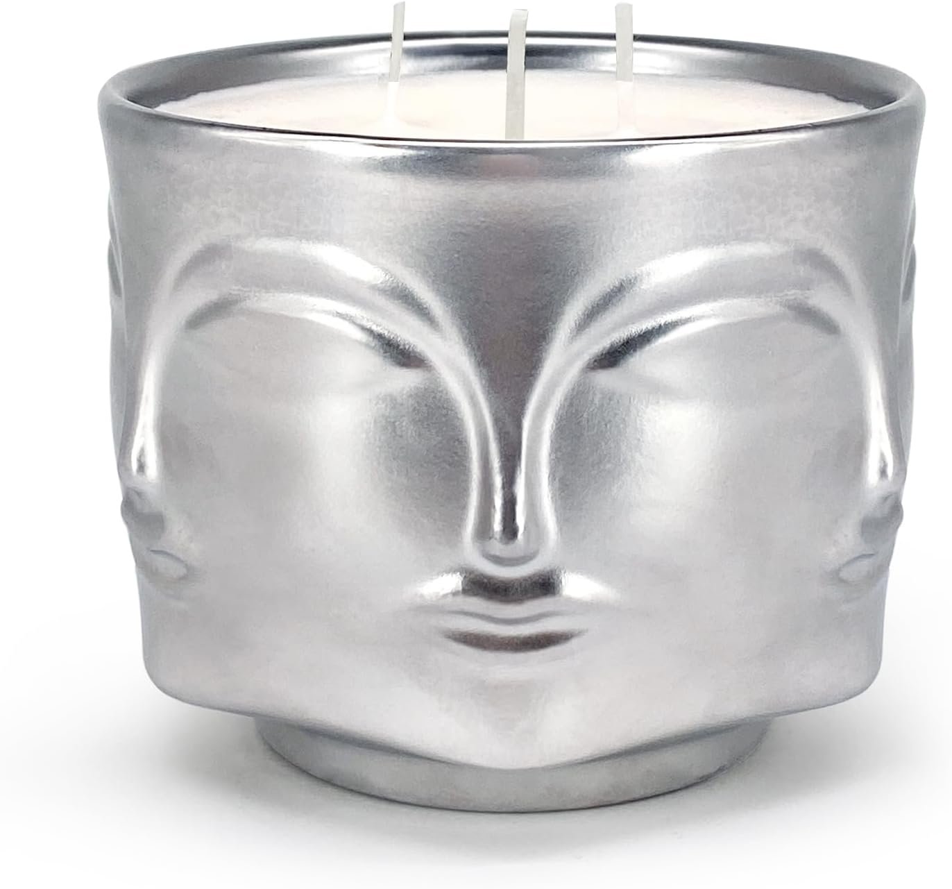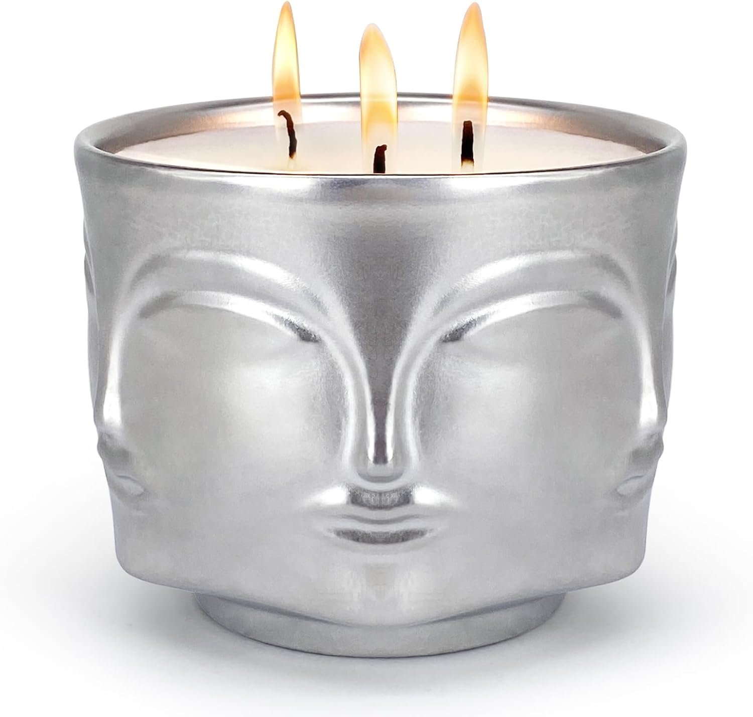 - Decorative Silver Buddha Face Ceramic Candle – Strong Black Berry scent, 20oz, 3 wick, black, long lasting with a 100-hour even burn, made with natural soy wax.